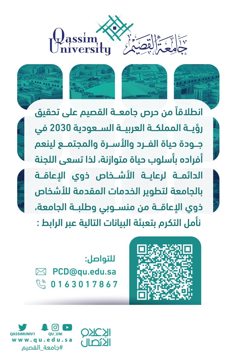 بين الجامعة والجهاز المركزي للإحصاء الفلسطيني لإطلاق برنامج البكالوريوس في تخصص الاحصاء وعلم البيانات. إختر جامعتك من هنا جامعة الأميرة نورة جامعة الإمام محمد بن سعود جامعة الأمير سطام جامعة الطائف جامعة الملك خالد جامعة أم القرى جامعة الملك عبدالعزيز جامعة طيبه جامعة القصيم. لقد ساعدتني جامعة الامارات في الاستعداد لبيئة العمل وتطوير مهاراتي وزيادة ثقتي بنفسي، ولذا أشكر جامعة. جامعة القصيم هي جامعة سعودية حكومية تقع في مركز المليداء شمال مطار الأمير نايف، وهي إحدى الجامعات الحكومية الشاملة، تشرف عليها وزارة التعليم السعودية ويتولى إدارة الجامعة أ.د. تخصص علاقات عامة وتخصص فرعي في دراسات الترجمة، إشادات الطلبة.
