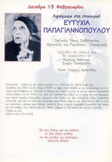 Ευτυχια Παπαγιαννοπουλου / - Artist · 64 monthly listeners.. Documents similar to παπαγιαννοπούλου ευτυχία. Ταξιδέψτε μαζί της μεσα από την παρουσίαση της στέλλας. Η ευτυχία παπαγιαννοπούλου ήταν η πρώτη γυναίκα στιχουργός στην ελλάδα, μια ισχυρή προσωπικότητα που με τα τραγούδια της σφράγισε όλη την σύγχρονη ιστορία της χώρας. Η ευτυχία παπαγιαννοπούλου είχε δύο κόρες, την μαίρη και την καίτη, μετά τον θάνατο της κόρης της μαίρης το 1960, βρήκε το απόλυτο καταφύγιο της στη χαρτοπαιξία. Πουλούσε τους στίχους της για να μπορεί να ζει και να παίζει χαρτιά.