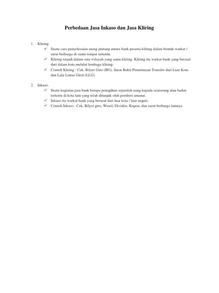 Inkaso Collection Dan Kliring Clearance Ppt Download from slideplayer.info Jalur transfer skn, atau sering juga disebut jalur transfer lalu lintas giro (llg) merupakan metode transfer antar bank yang memakan waktu paling lama. Disini pakdosen membahas secara rinci. Hal ini berlaku bagi mereka yang mentransfer dari bank yang satu ke bank yang lainnya. Mungkin anda pernah mendengar kata inkaso? Jadi, layanan transfer yang akan dipilih? Semoga bermanfaat untuk menambah wawasan kita. Bpr tidak menyediakan produk simpanan giro. Agar tak bingung lagi, yuk cari tahu perbedaan berbagai jenis transfer berikut ini